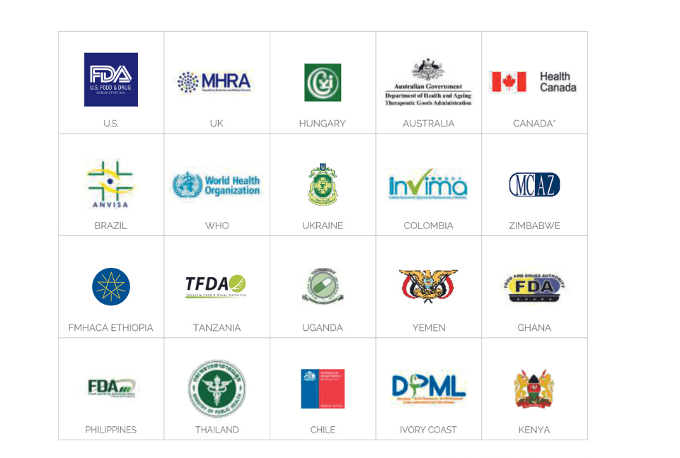 GMP / EUGMP / WHO Certified Manufacturing Units for CECMED, PROMESS, ANMAT, ISPCH, INVIMA, ARCSA, DIGEMID, European Medicines Agency (EMA), ANSM, SMCA, NAMMD, Icelandic Medicines Agency, Norwegian Medicines Agency Approved, Swiss Agency for Therapeutic Products Approved, Turkish Medicines and Medical Devices Agency Approved, SCDMTE, SFDA, DPMED, DPML, FDA, ARFA, FDA Ghana Approved, MoH Gambia Approved, AIRP, PPB Kenya, MOH Liberia Approved, NAFDAC, MOHD, NMPB Sudan, GDPA, TGA Australia, FDA, MOH of Tajikistan, and Kosovo Medicines Agency Approved in India.